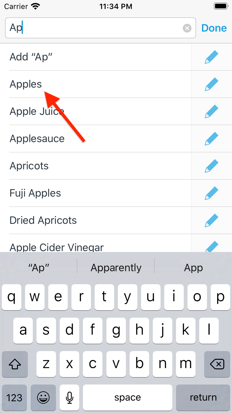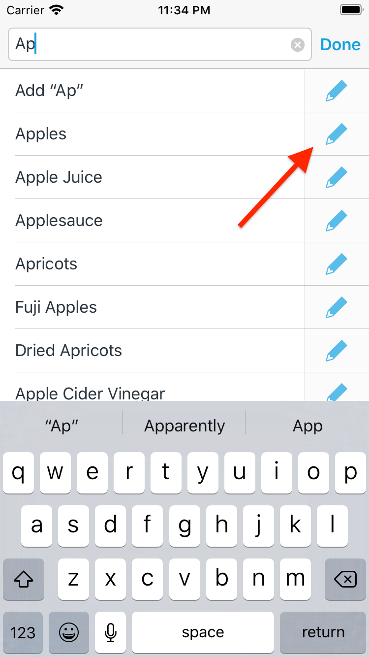 Start typing the name of an item and tap on the pencil icon for the item you wish to edit.