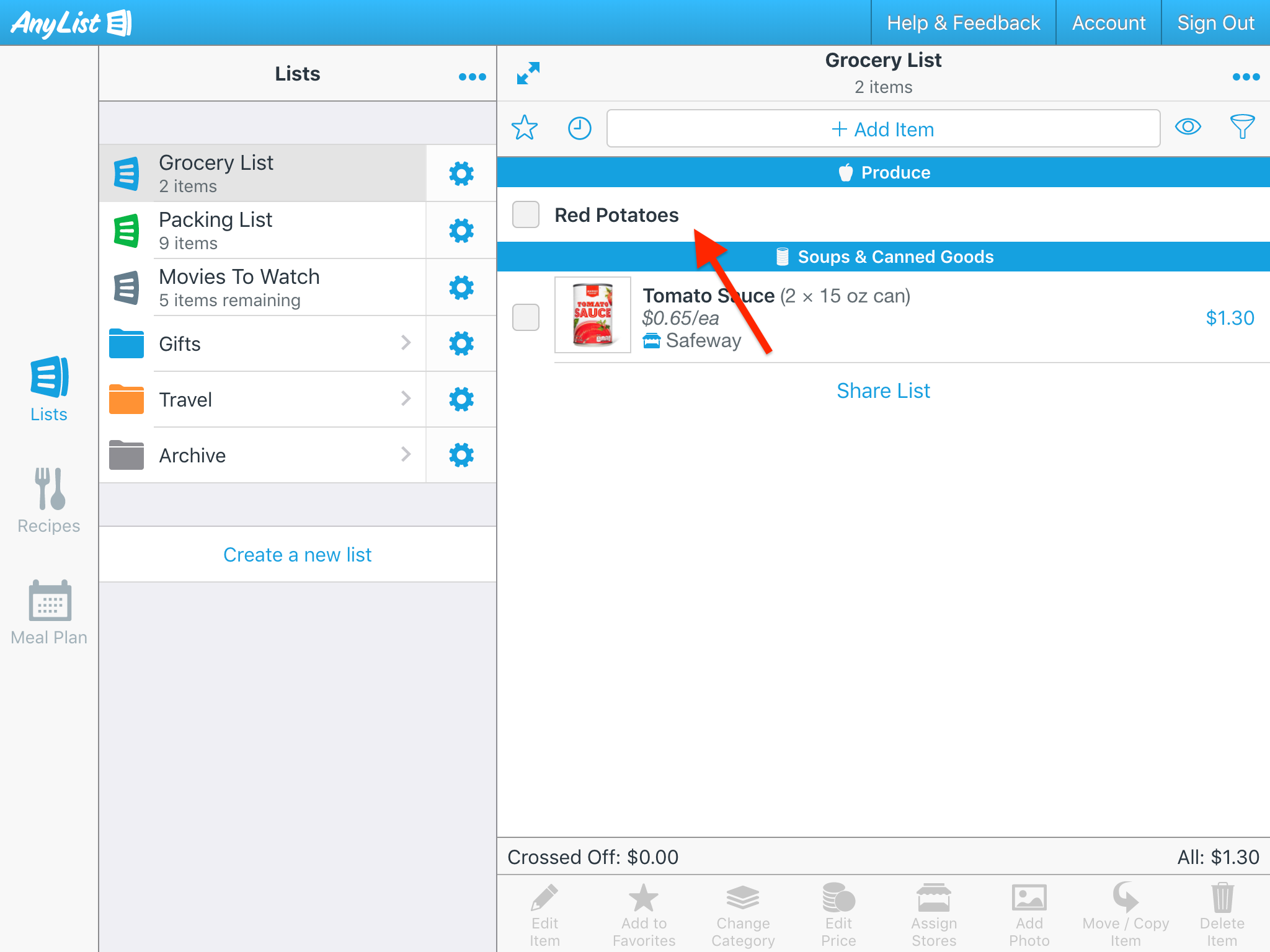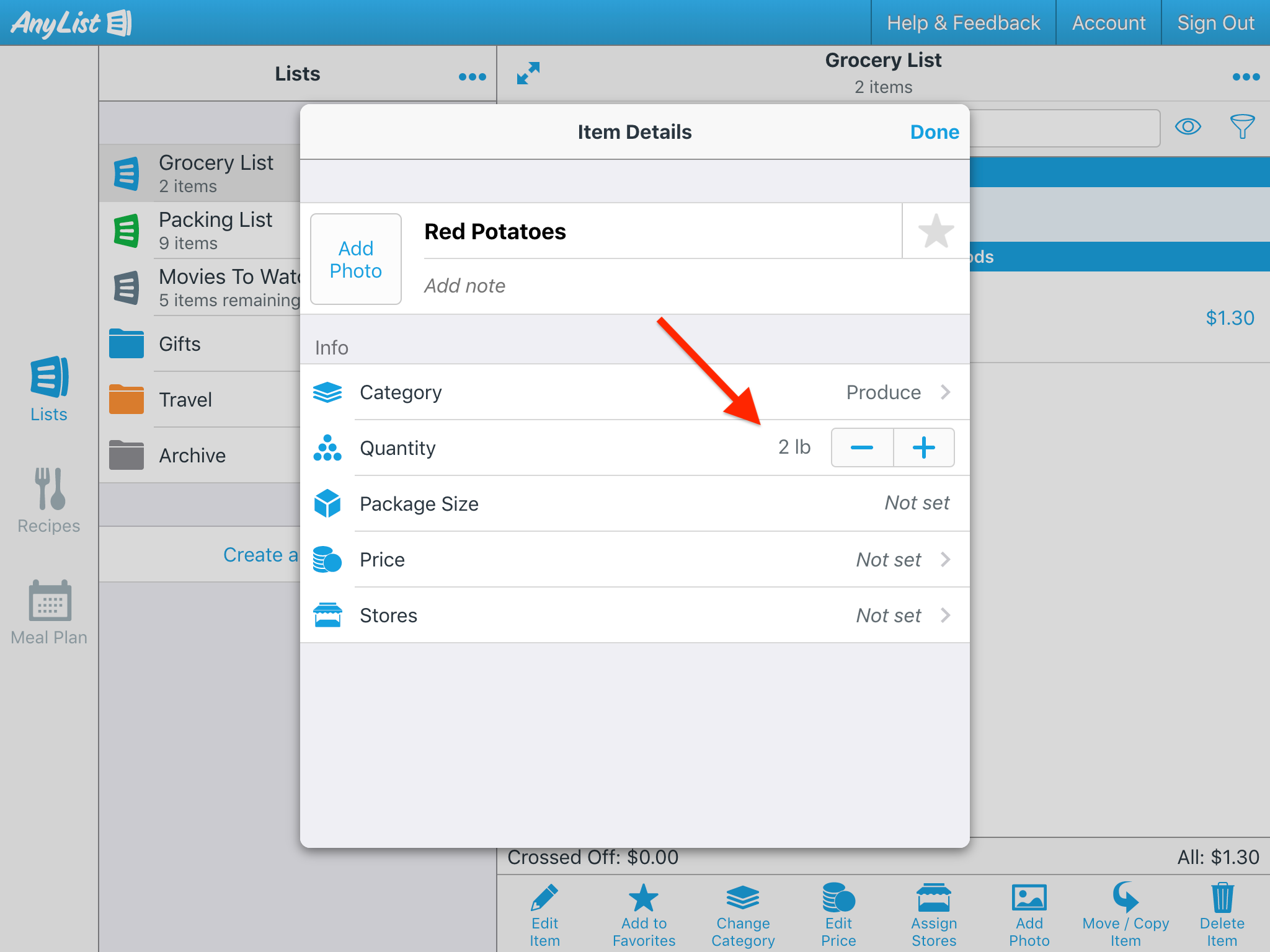 If you’re using item prices and enter a quantity that doesn’t correspond to how the item is sold (e.g. you have 3 apples on your list, but they are sold by the pound), then you can adjust the quantity used to caclulate the total cost of the item.