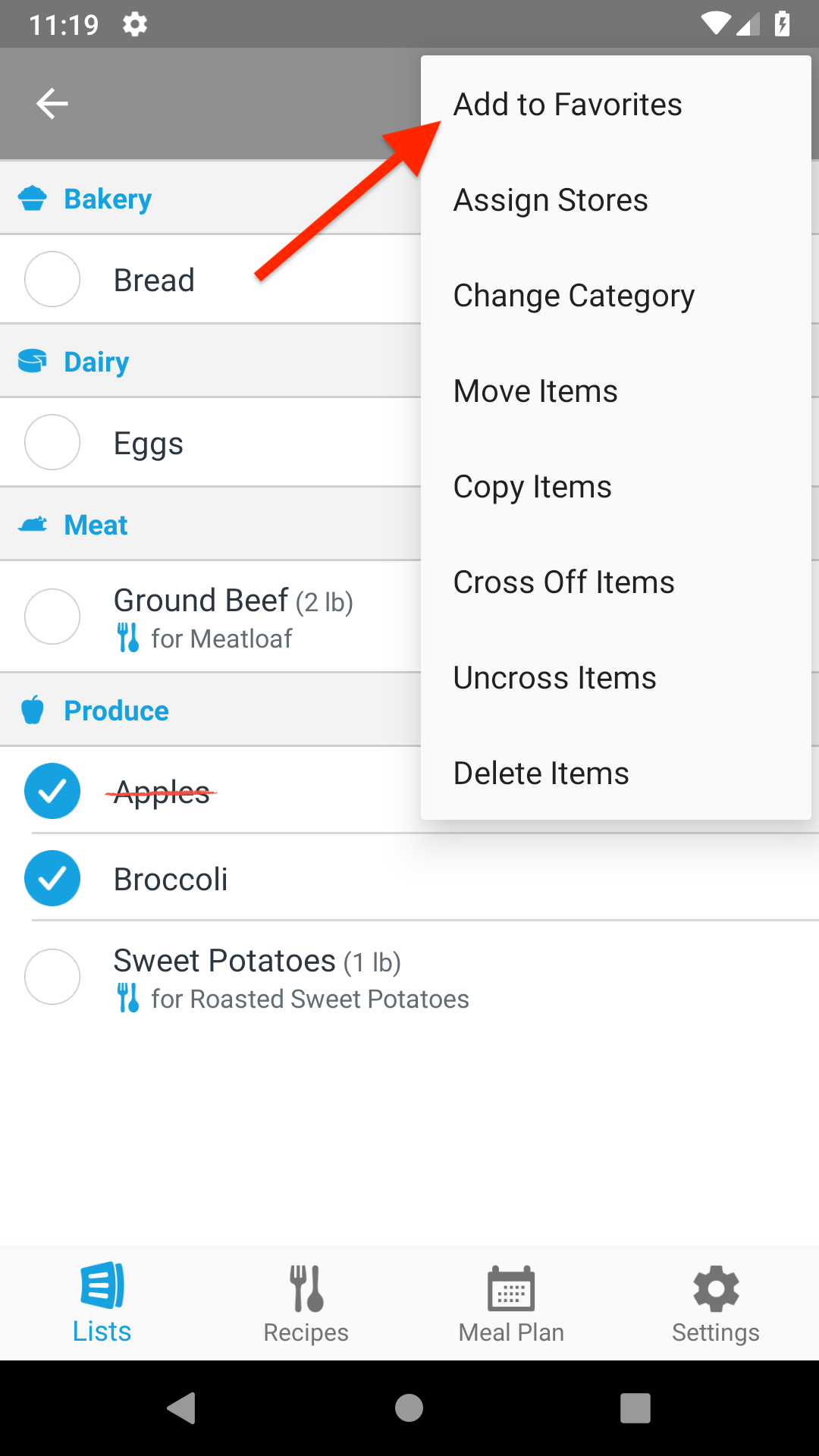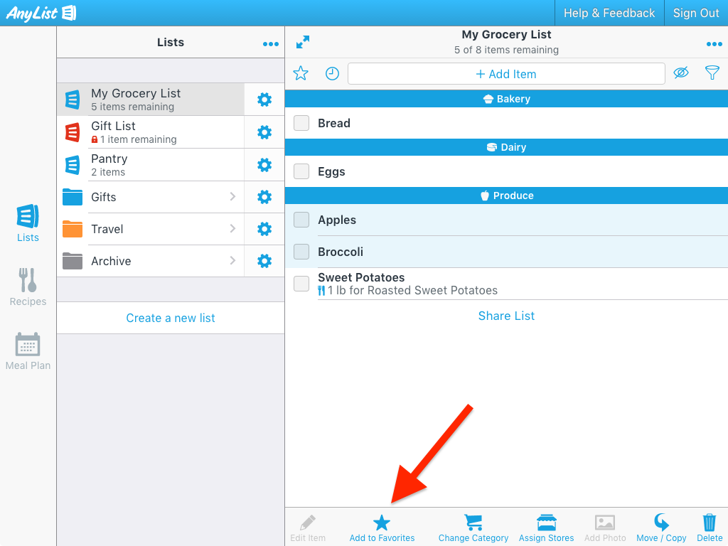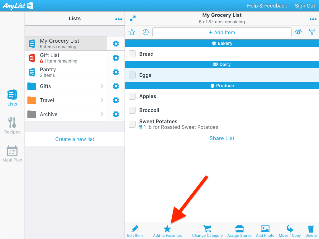 You can mark items that you frequently purchase as favorites to make it easy to re-add those items to your list in the future.