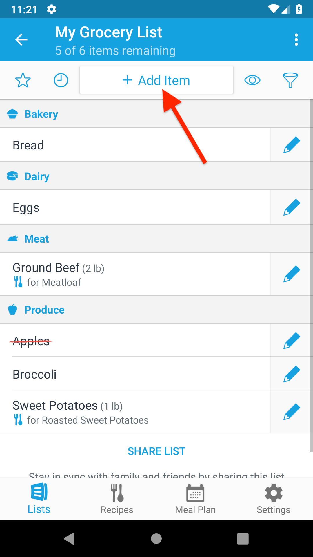 When using the Add Item field to add items to your list, favorite items are automatically suggested as you type.