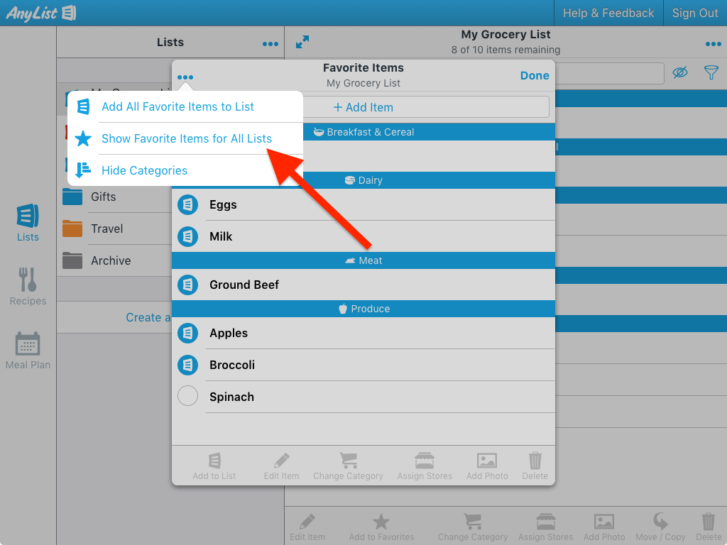 To view favorites from across all lists, open the Favorite Items screen, then tap the More Actions (…) button, then tap on Show Favorite Items for All Lists.