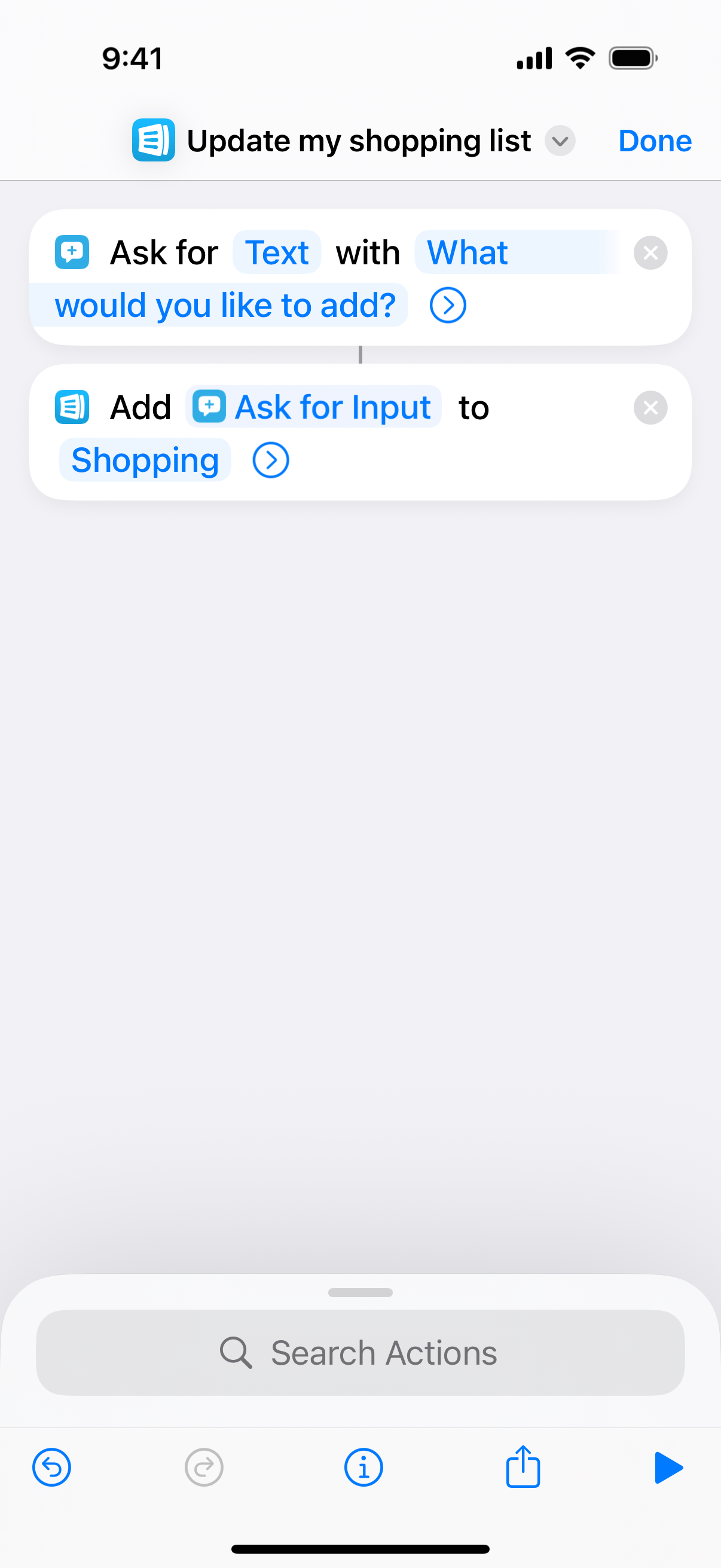 In the AnyList action, change the input, Item Name, to Ask for Input. Then Done in the top-right corner to save your changes.