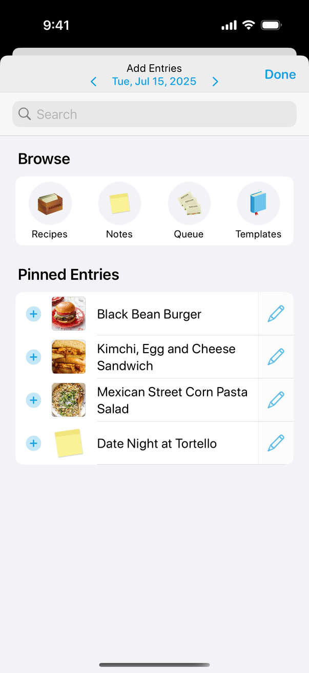 You can pin your favorite recipes and notes for convenient access from the Meal Plan’s Add Entries screen.