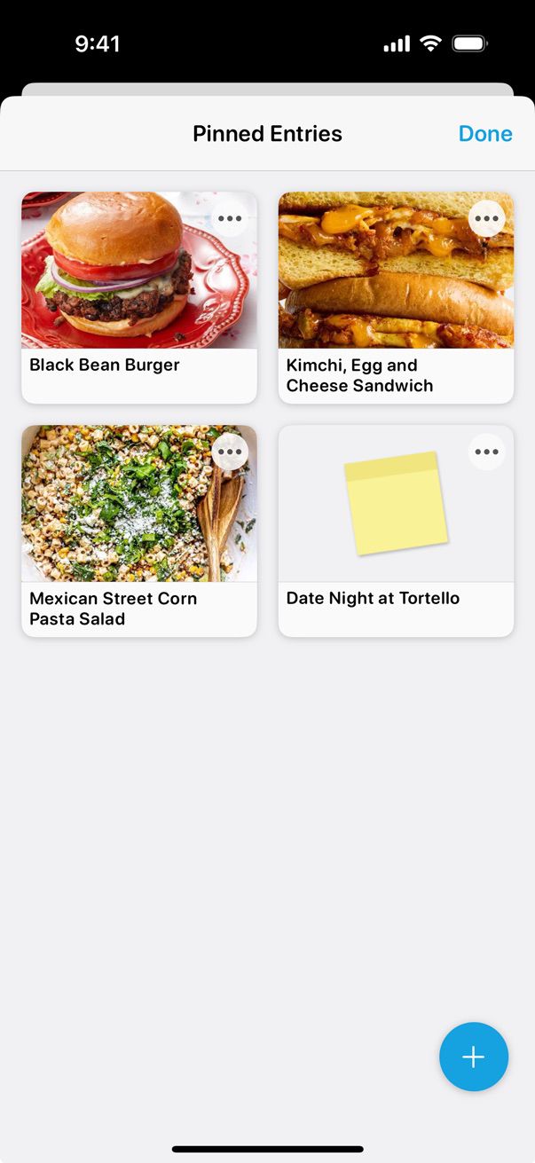 To get started, select the Meal Plan tab at the bottom of the screen. Then tap the Actions (•••) menu in the upper right and select Pinned Entries.